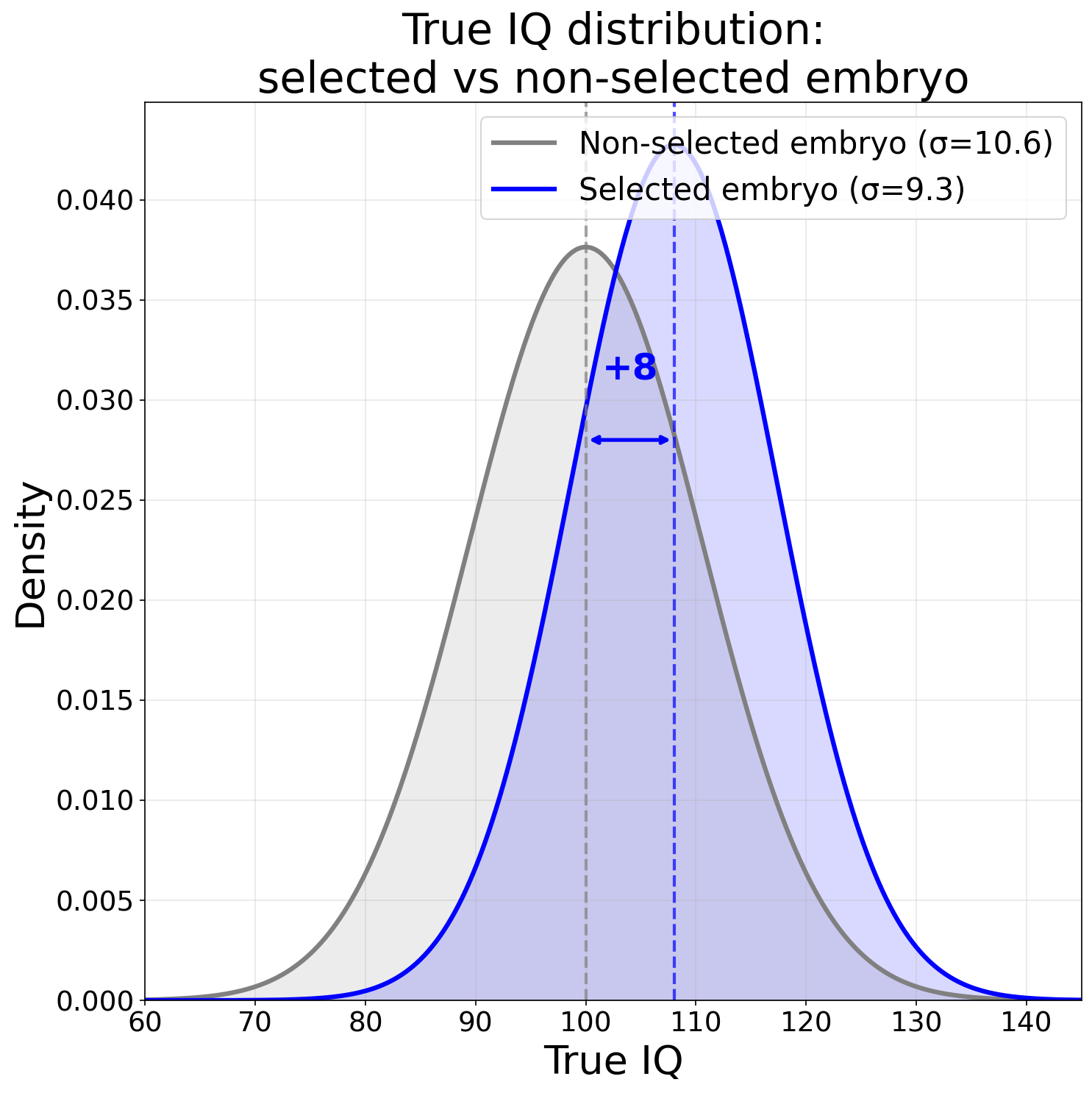 For the statistics nerds: the best way to think about what embryo screening does is it shifts and narrows the distribution for a given trait. For example, here's a graph showing the distribution of IQ scores for a random embryo and one with a predicted IQ of +8: