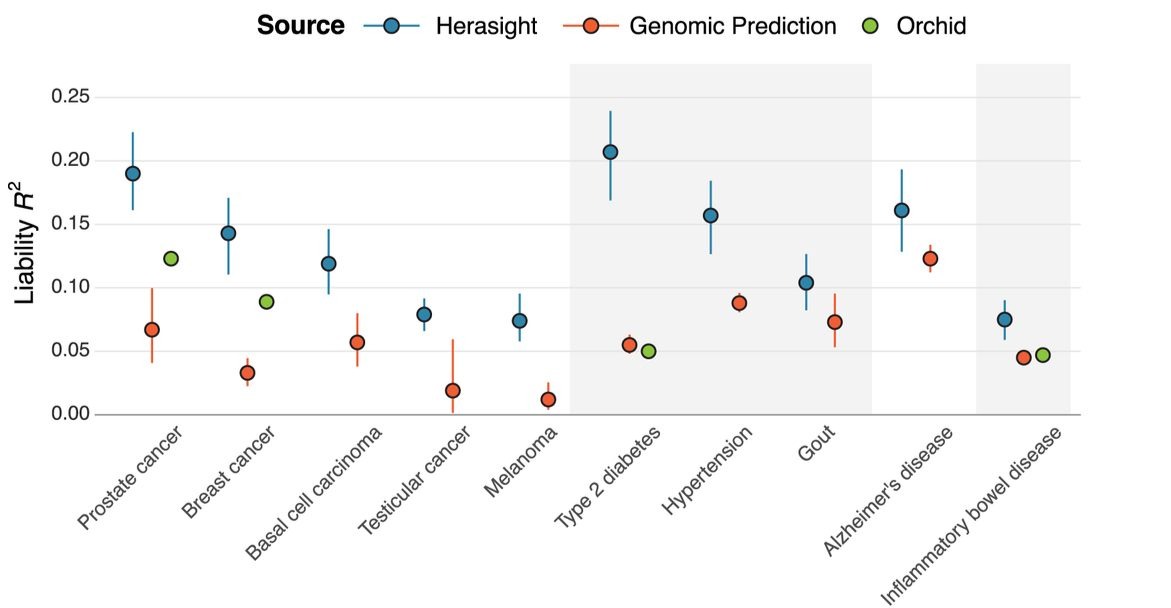 Validation method matters too. Validating on unrelated people can overstate accuracy for some conditions because it picks up population-level signal that siblings share. Both Herasight and Nucleus have published within-family validation. Orchid and Genomic Prediction have not.